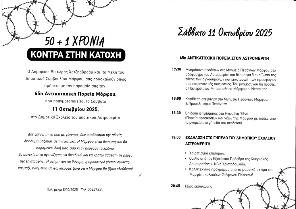 45η ΑΝΤΙΚΑΤΟΧΙΚΗ ΠΟΡΕΙΑ ΔΗΜΟΥ ΜΟΡΦΟΥ08/10/2025 https://www.morphou.org.cy/wp-content/uploads/AFISA-2.jpg 771 554 Andri Kyriacou https://www.morphou.org.cy/wp-content/uploads/logo_GR.png Andri Kyriacou2025-10-08 14:32:242025-10-08 14:33:5745η ΑΝΤΙΚΑΤΟΧΙΚΗ ΠΟΡΕΙΑ ΔΗΜΟΥ ΜΟΡΦΟΥ